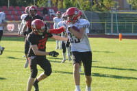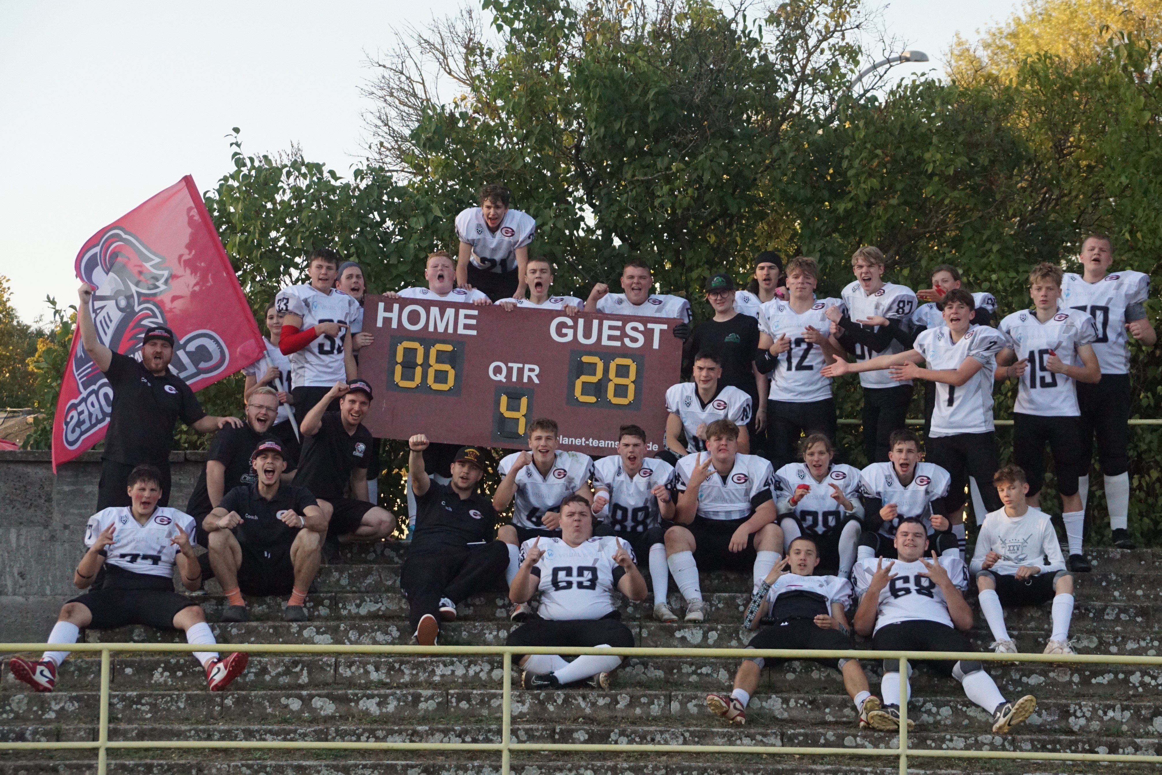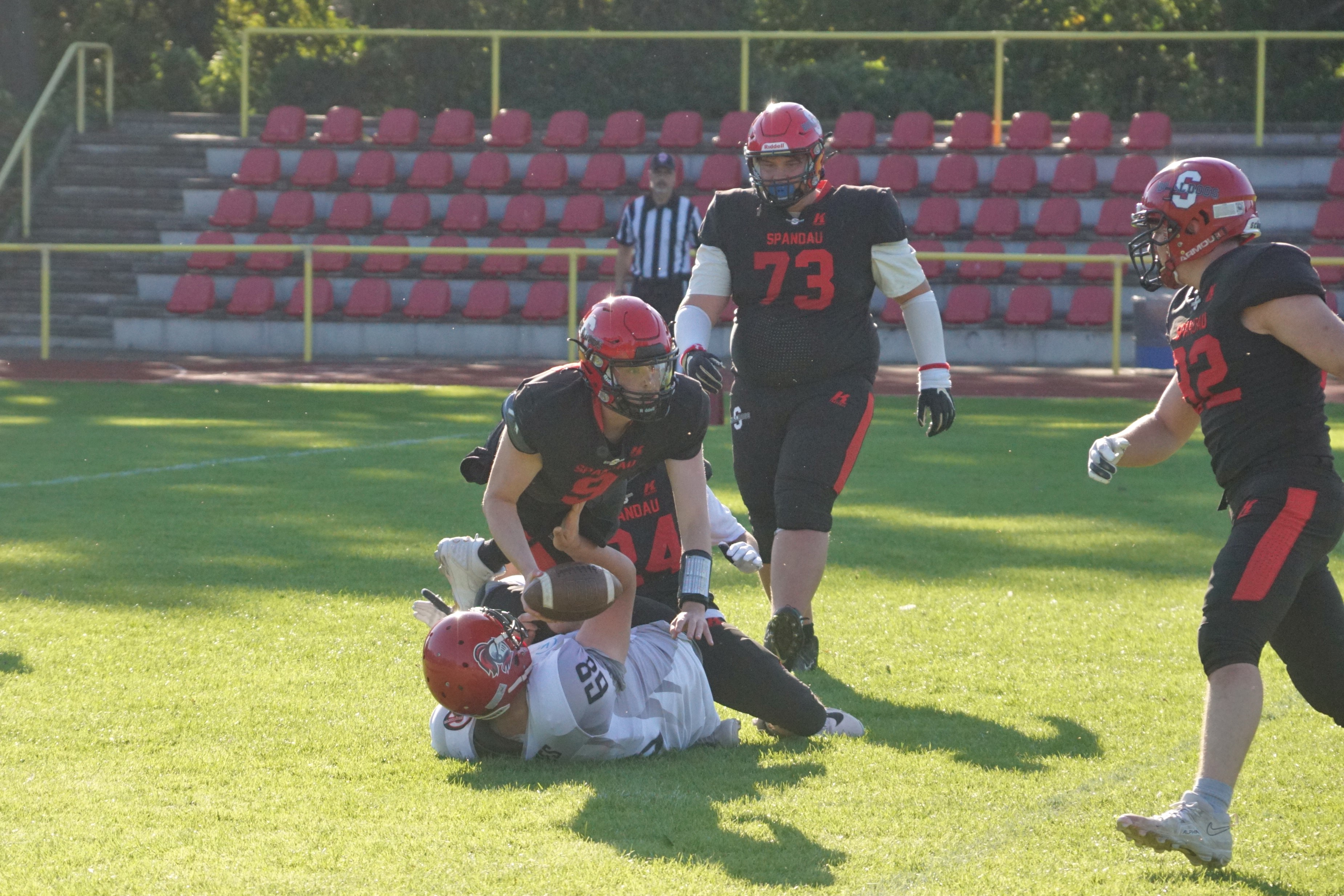 Auch im letzten Spiel der Saison in der 9er B-Jugend-Liga im AFCVBB blieb die Spielgemeinschaft aus Chemnitz Claymores und Erzgebirge Miners erfolgreich. Im Spiel am gestrigen Samstag bei den Spandau Bulldogs stand am Ende ein 6:28 (0:14/6:0/0:0/0:14) auf der Anzeigetafel. Der Herbst zeigte sich noch einmal von der schönsten Seite, als das Spiel gleich mit einem Paukenschlag begann. Die Chemnitzer Offense um Quarterback Darian Mau (#5) betrat das Feld und Runningback Damian Arnold (#33) bekam den Ball. Er lief und lief und lief bis zum Touchdown - ein Auftakt nach Maß und die FÜhrung mit 0:7 (Extrapunkt Nils Lötzsch #88). Während die Defense nun nichts anbrennen ließ, legte die Offense nach. Wiederum war Damian Arnold (#33) mit einem Touchdown erfolgreich. Die Führung wuchs auf 0:14. Wer nun aber erwartet hätte, dass das Spiel in diesem Stile weiter gehen würde, sah sich schnell eines Besseren belehrt. Die Spandau Bulldogs kamen nun besser ins Spiel und konnten einige Raumgewinne verbuchen. Nur Zählbares sprang nicht heraus. Auf der anderen Seite hatten die Spandauer auch ihre Hausaufgaben gemacht und konnten wesentlich besser auf die Chemnitzer Offensivbemühungen reagieren. Das gipfelte schließlich in einem Interception-Return-Touchdown zum 6:14. Damit ging es auch in die Halbzeitpause.