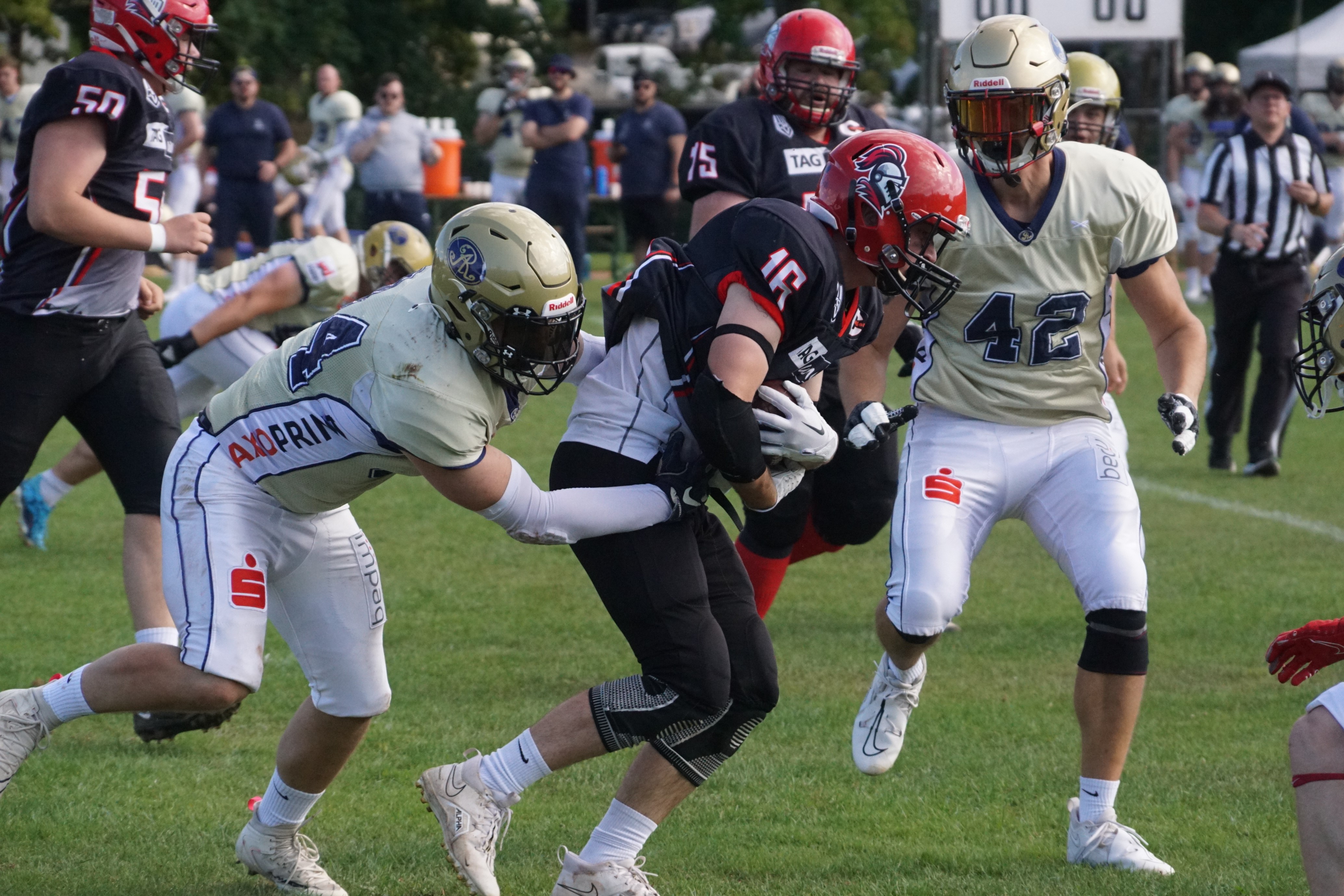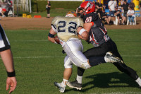 Nach der Pause machte die Chemnitzer Defense dort weiter wo sie aufgehört hatte und schickte die Gäste aus Dresden schnell wieder vom Feld. Aber auch die Dresdener Defense kam nun besser zur Geltung. So verhinderten sie nun mit einer Interception in der eigenen Endzone weitere Punkte für Chemnitz. Selbst gelangen aber keine Punkte, so dass schließlich die Chemnitzer Offense wieder auf das Feld kam. Nick Henschel (#81) war nun bereits auf und davon in die Endzone unterwegs gewesen, doch Strafen machten dies zunichte. Schließlich trennten sich die Chemnitz Crusaders erstmalig per Punt durch Dominique Ittner (#30) vom Angriffsrecht. Dabei gelang es, die Dresdener Offense an der eigenen 1-Yard-Linie auf das Feld zu zwingen. Es kam wie es kommen musste. Die Chemnitzer Defense übte enormen Druck aus und Luca Engelmann (#90) konnte den Dresdener Ballträger noch in dessen Endzone stoppen - Safety und zwei Punkte zum 29:8 für Chemnitz. Die Defense-Reihen bestimmten das Geschehen. Die Chemnitzer Offense verlor mit beginnendem 4. Viertel den Ball durch ein Fumble während bei den Dresdenern ein Touchdown aufgrund Strafen nicht gegeben wurde. In diesem Stile lief das Spiel weiter. Als dann Runnigback Florian Fritzsche (#21) wieder einmal mit einem schönen Laufspielzug unterwegs war, geschah das Unerwartete. Eine Flagge flog wegen einem Targeting - allerdings gegen den Chemnitzer Runningback. Diese harte Strafe ist mit einer gleichzeitigen Disqualifikation verbunden. Nachdem sich die Chemnitz Crusaders per Punt wieder vom Angriffsrecht getrennt hatten, nahm die Offense der Gäste noch einmal Fahrt auf und konnte die sich durch diverse Rotationen auf Chemnitzer Seite bietende Gelegenheit zum letzten Touchdown des Tages nutzen. Mit 29:14 endete schließlich das Spiel.